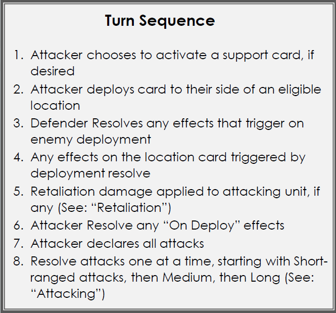 Starting with the player who has the first player token, players alternate deploying (playing) units from their hand, one at a time, to their side of one of the available locations. When a unit is deployed, resolve the steps below, with the player deploying a card being the “Attacker” and the other player being the “Defender.”