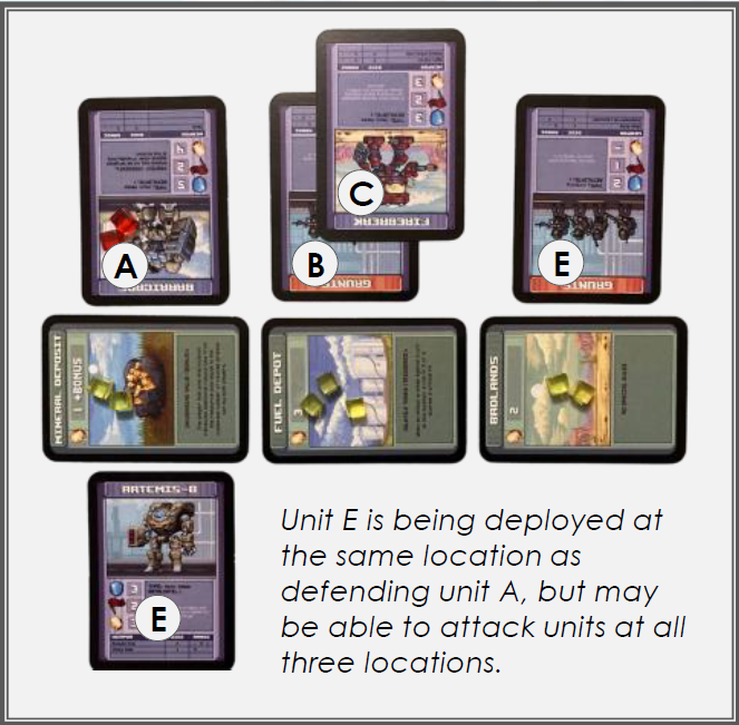 Short range attacks are allocated to enemy units at the same location as the attacking unit. Medium range attacks are allocated to enemy units one location to the left or right of the attacking unit’s location. Long range attacks are allocated to enemy units two locations to the left or right of the attacking unit, (meaning that a unit in the middle location is not at Long range to any other locations). A unit may attack with all of the weapons it has when it is deployed, as long as there are valid enemy units to target.
